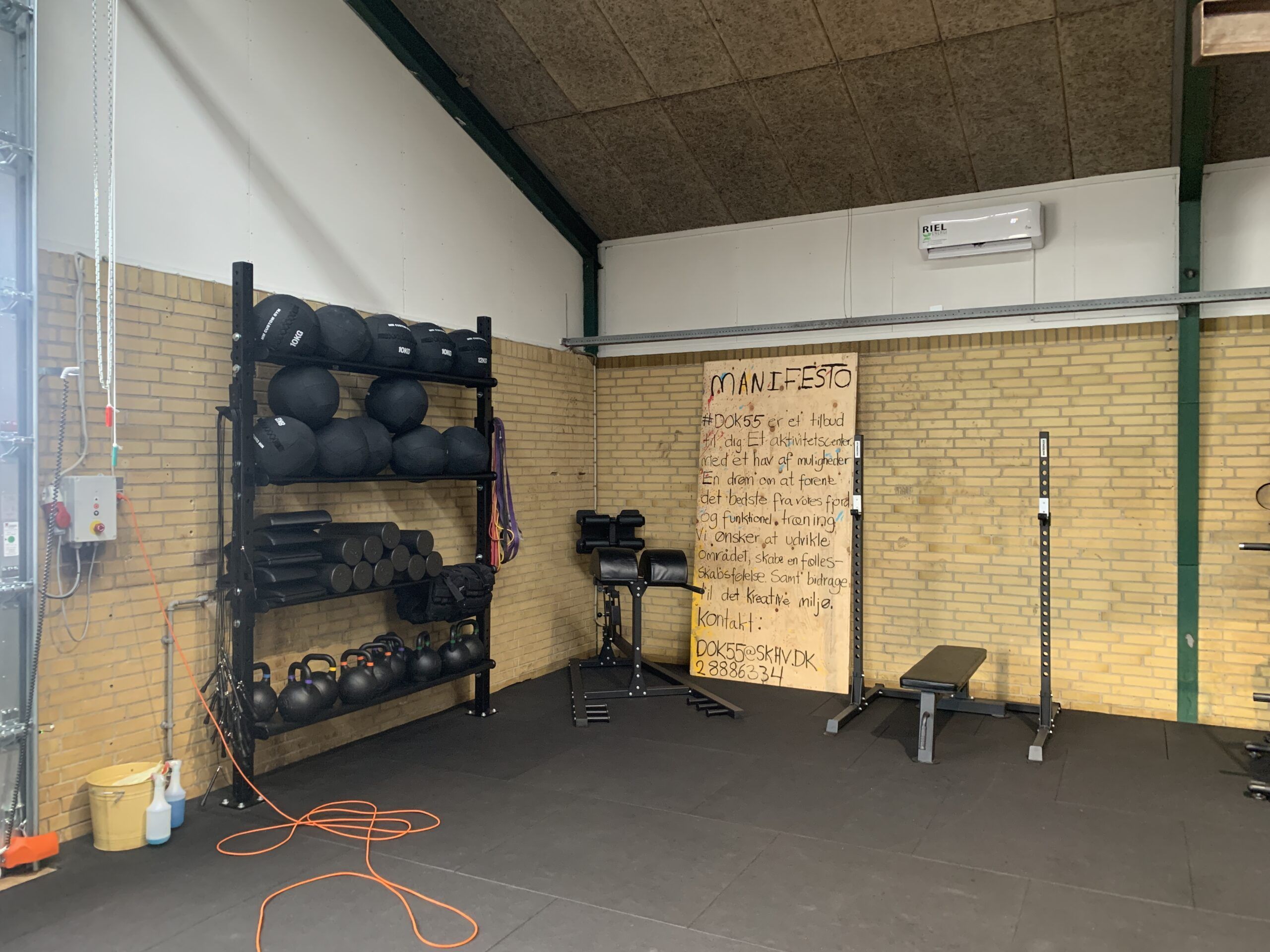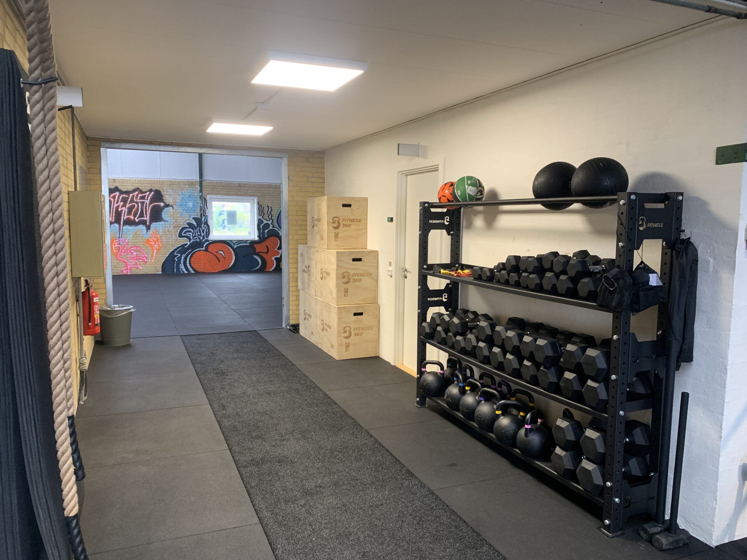 Rummet er indrettet med masser af gulvplads, rigeligt med kettlebells, håndvægte og wall balls – og der er tænkt i zoner, så flere kan træne samtidig uden at gå på kompromis med plads og flow.