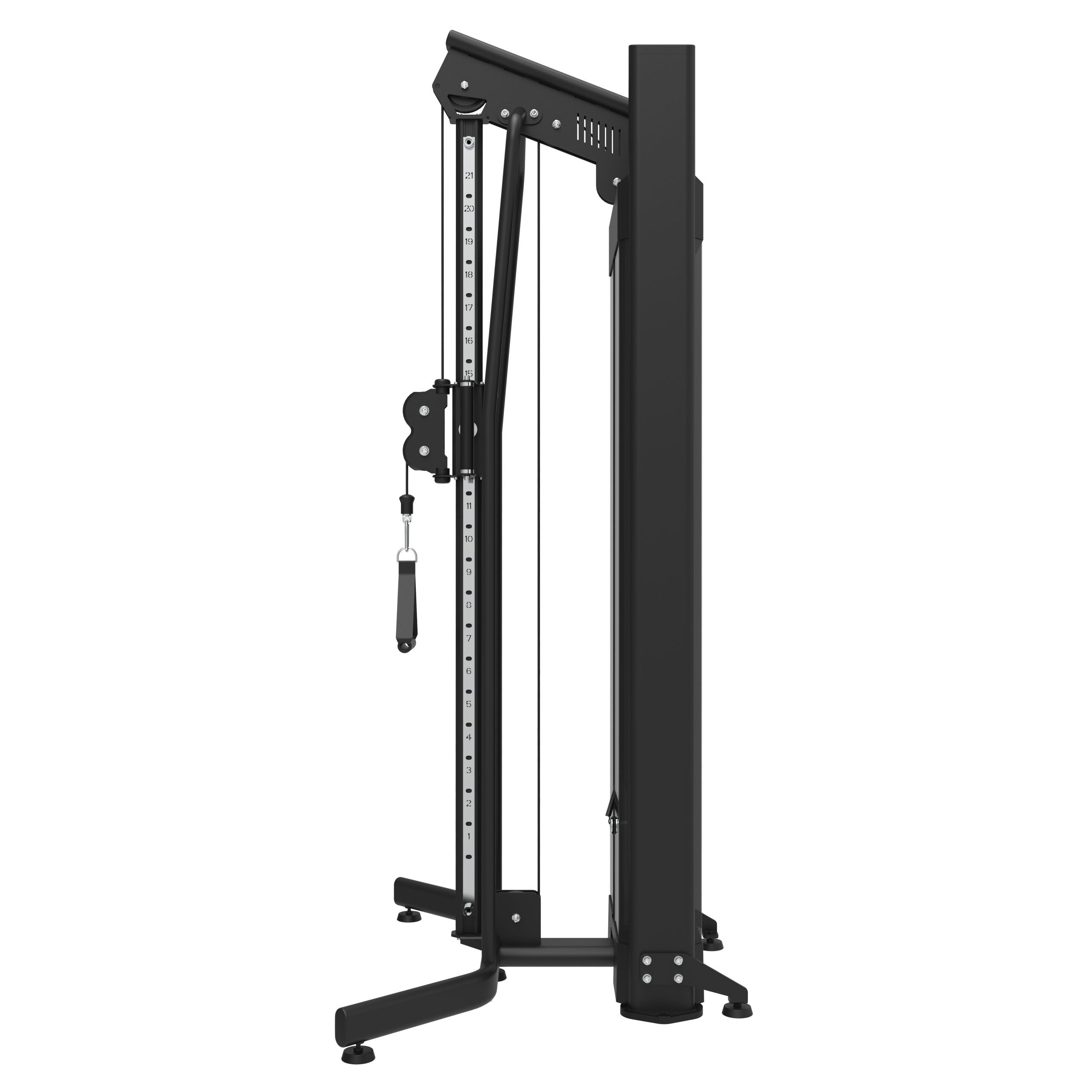 Vores professionelle Cable Station Single er det ideelle valg til træningsfaciliteter med begrænset plads, som stadig ønsker at tilbyde et bredt udvalg af træningsmuligheder. Kabeltrækket kan justeres i forskellige højder, hvilket giver mulighed for at skifte mellem høje og lave positioner afhængigt af øvelse og fokusområde. Maskinen er udstyret med et vægtmagasin på 95 kg, hvilket sikrer en bred spændvidde for både begyndere og erfarne brugere. Derudover giver muligheden for at påføre forskellige håndtag og tilbehør en enorm variation af øvelser til både overkrop og underkrop.
