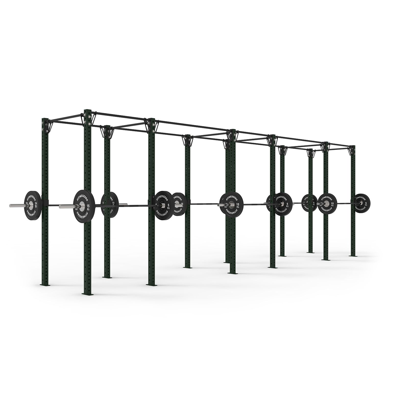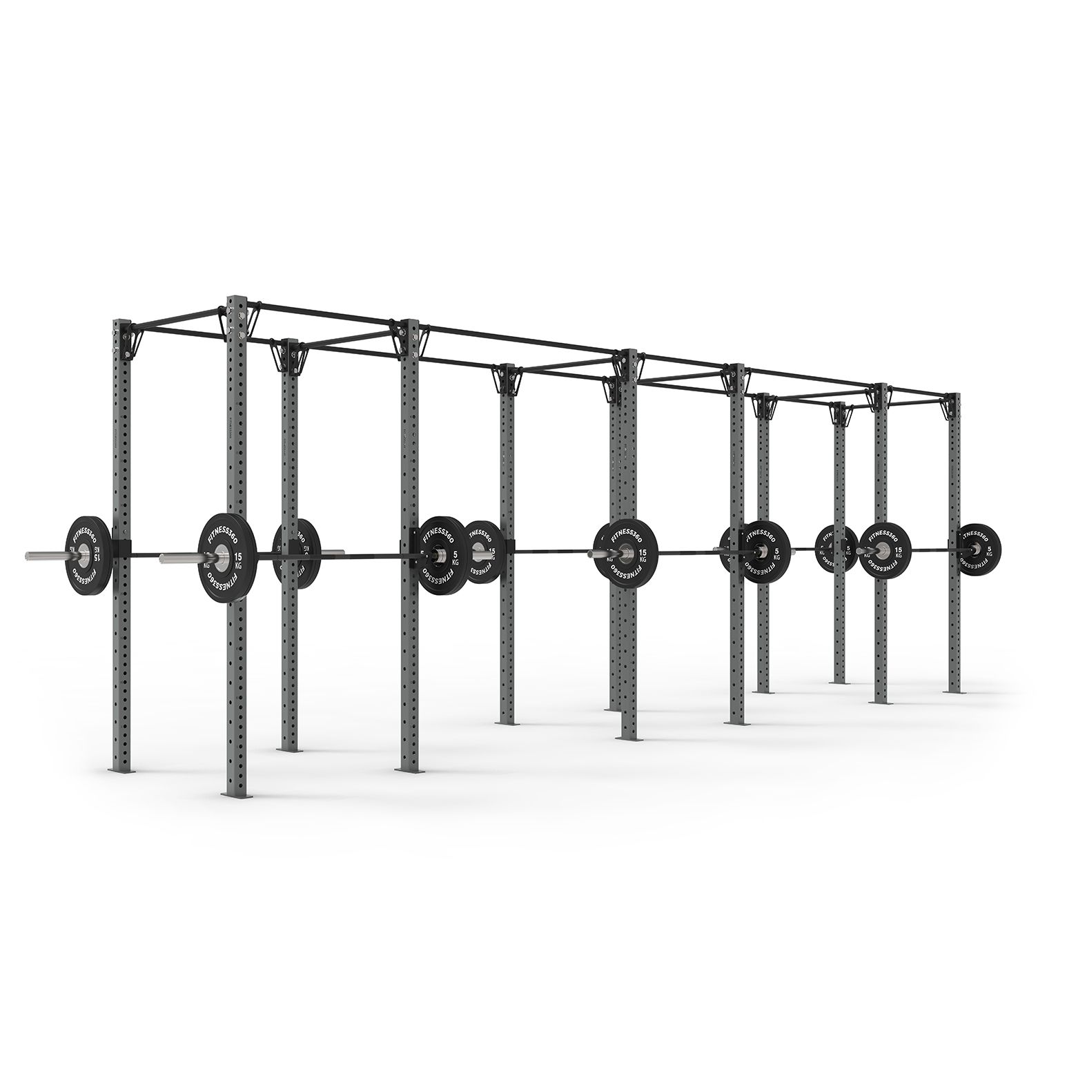 Dette fritstående rig består af 12 stk. stolper på 256 cm, 4 stk. pull up bars på 180 cm og 12 stk. pull up bars på 108 cm. Stolperne skal fastgøres i gulvet.