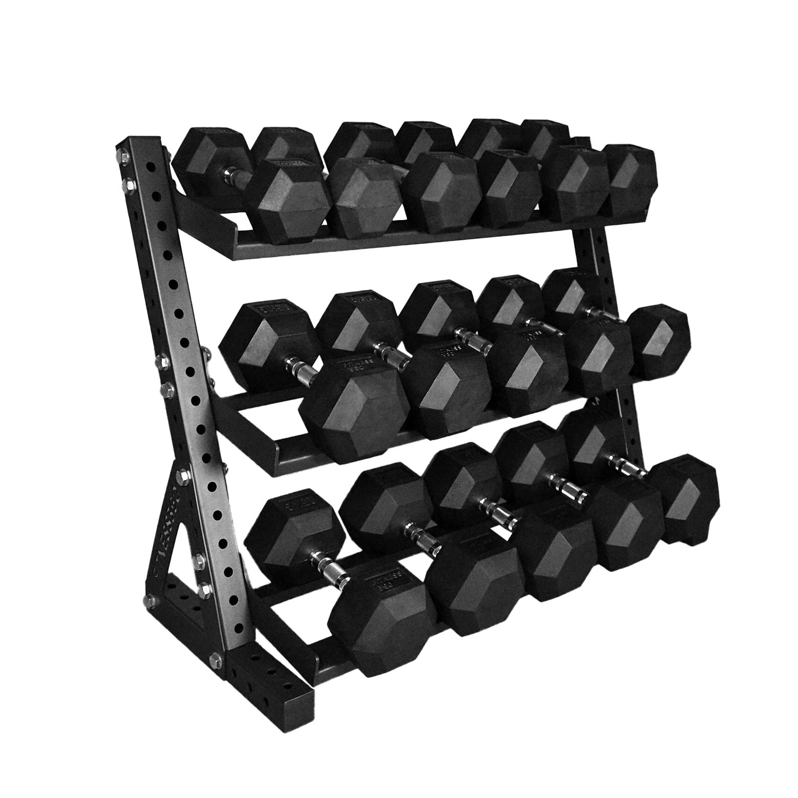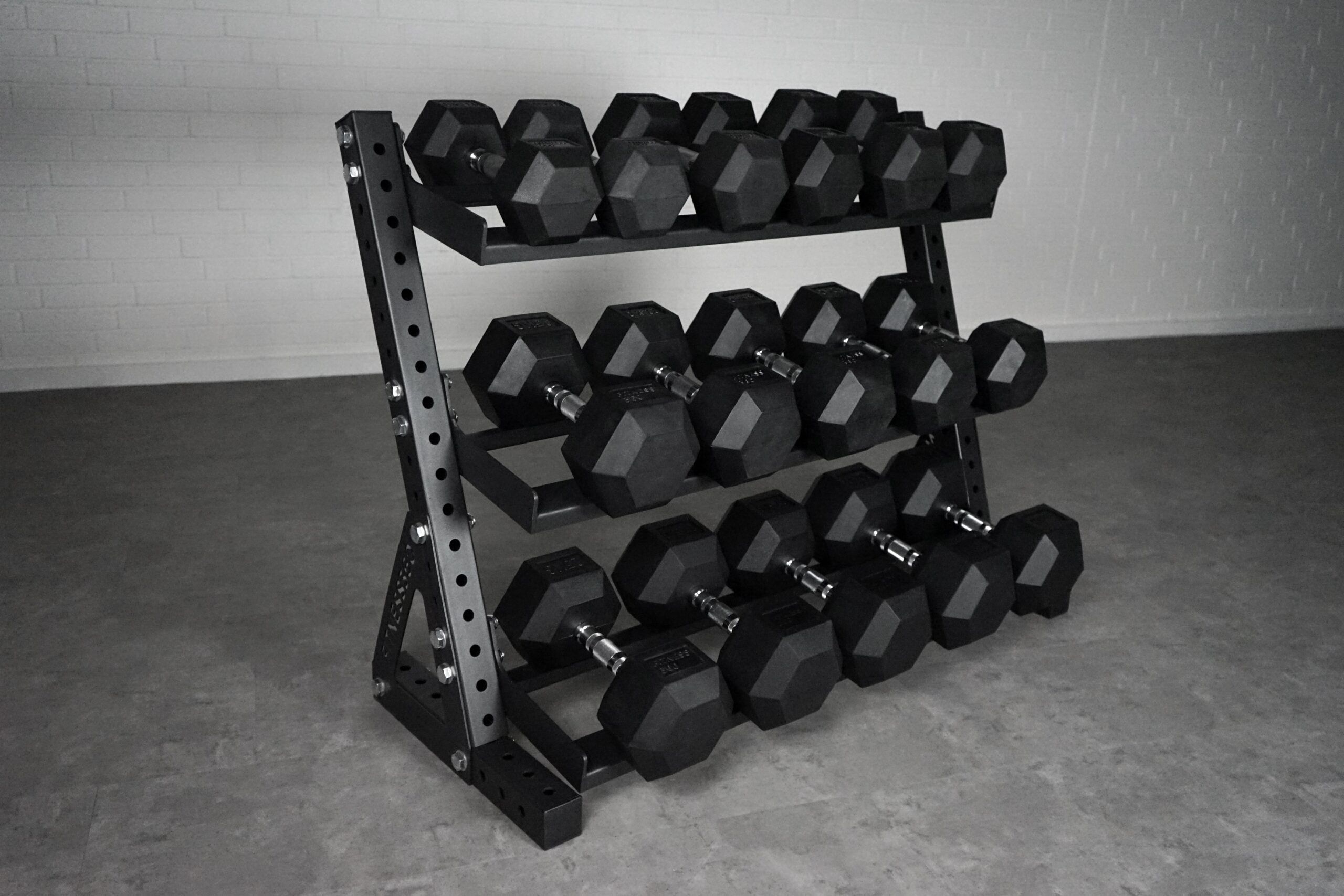 Håndvægte med stativ inkl. håndvægtssæt (dumbbells) fra 12,5-30 kg. Et stærkt pakketilbud til pro eller privat. En pladsbesparende løsning der er ideel til både home gyms og kommercielle lokationer. Hjælp dig selv (eller dine medlemmer) med at holde orden på håndvægtene, ved at fremvise udvalget af dumbbells på en pæn og overskuelig måde. Det er træls for alle, når håndvægte ligger og flyder på gulvet, og det er uoverskueligt at finde den rigtige. Du vil med garanti få stor glæde af dette stativ til håndvægte! Hver hylde har en stålkant, så håndvægtene forbliver på stativet.