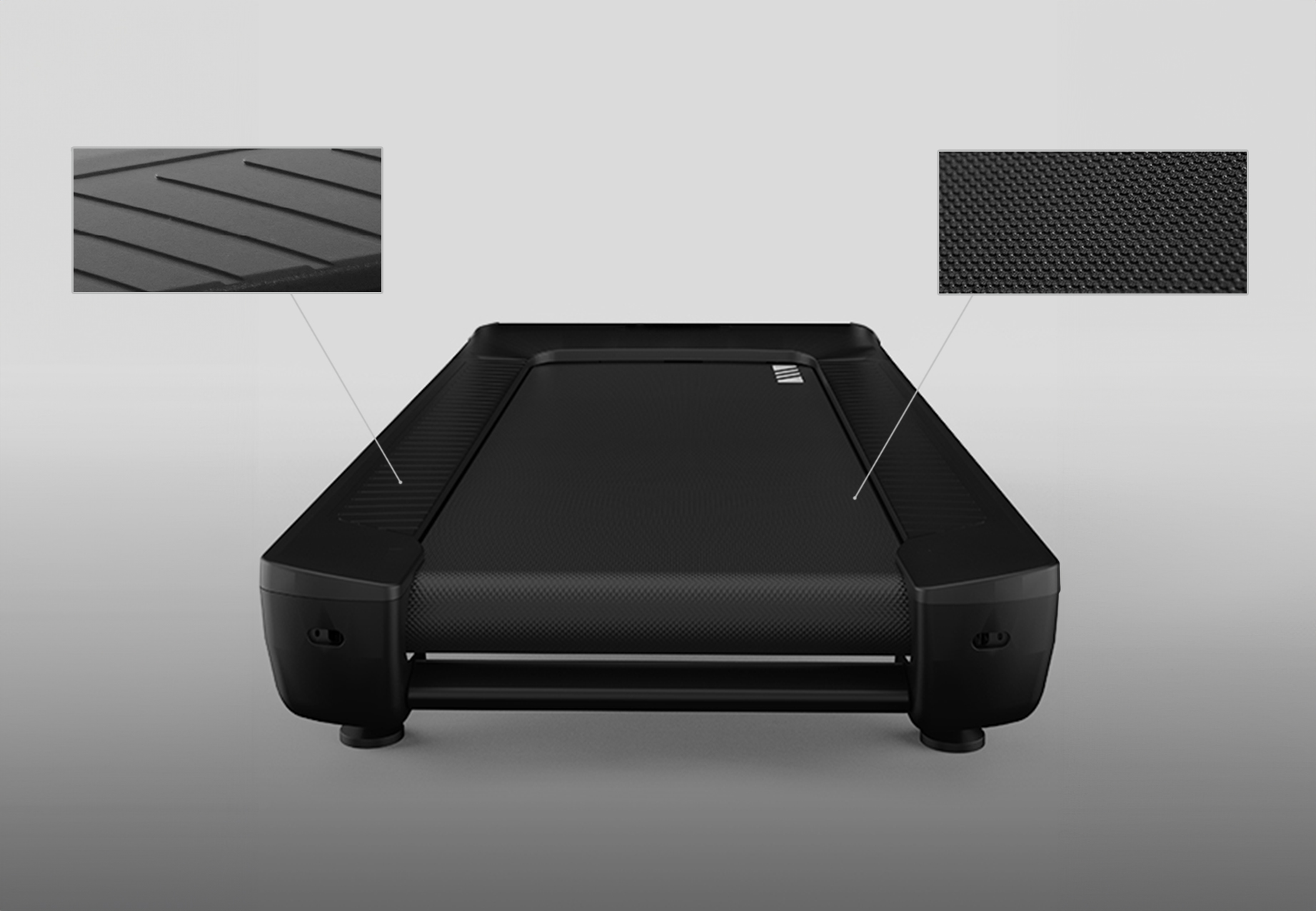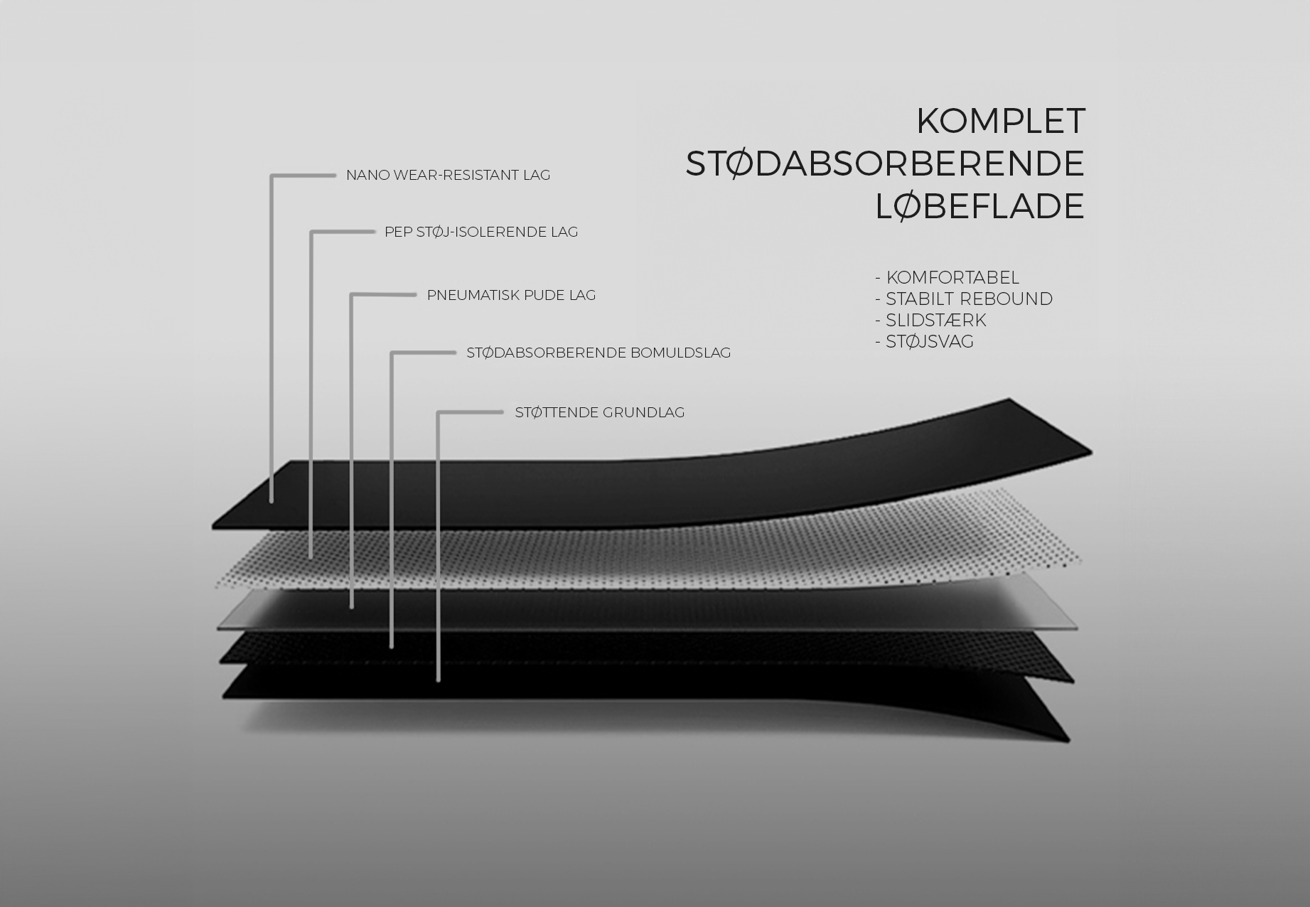 Løbebåndet består af 5 underlag: Et støttende grundlag med et stødabsorberende bomuldslag, polstret med en pneumatisk pude lag og et PEP støj-isolerende lag. Dertil omsluttet af et slidstærkt nano wear-resistant lag. Alt dette gør tilsammen båndet både slidstærkt og støjsvagt.