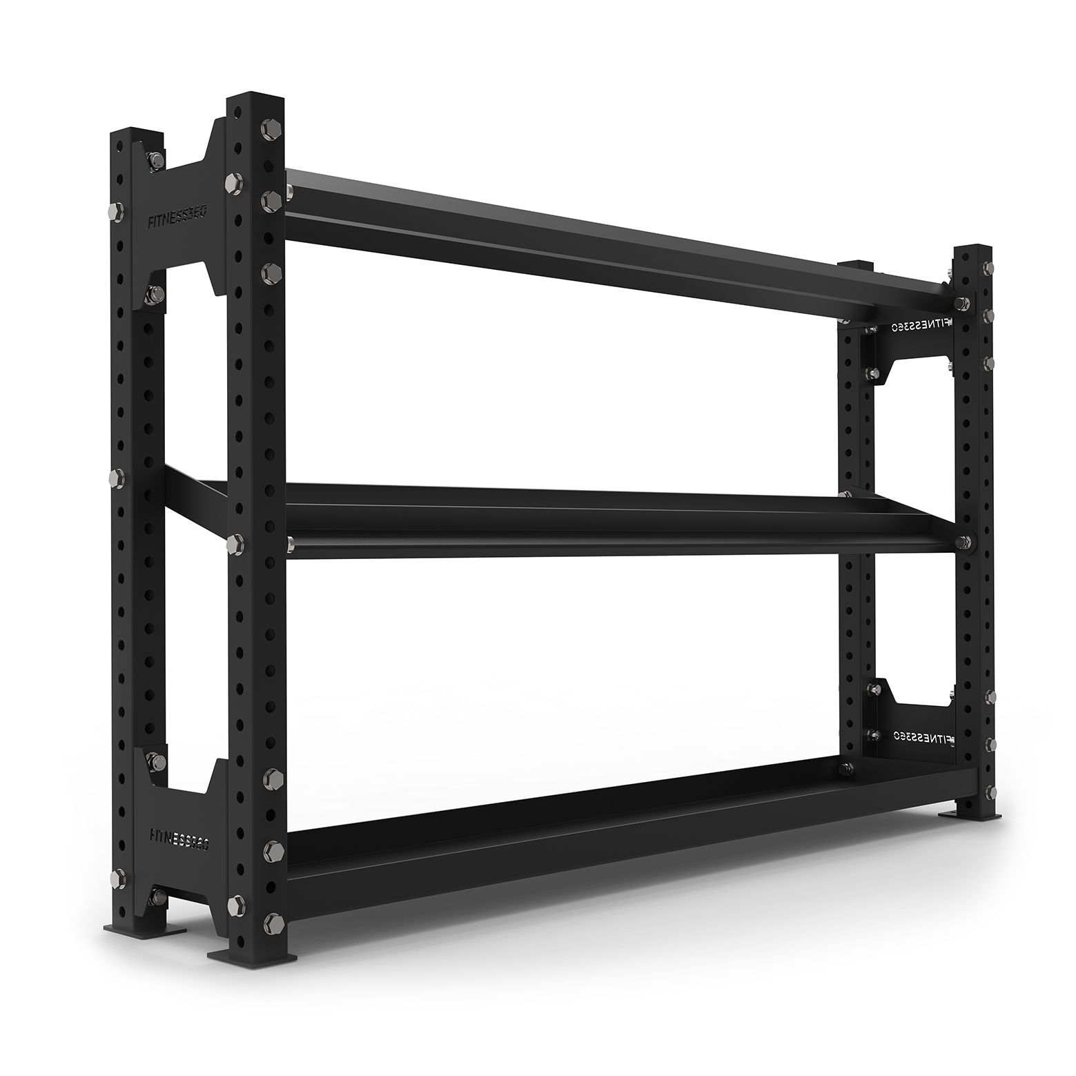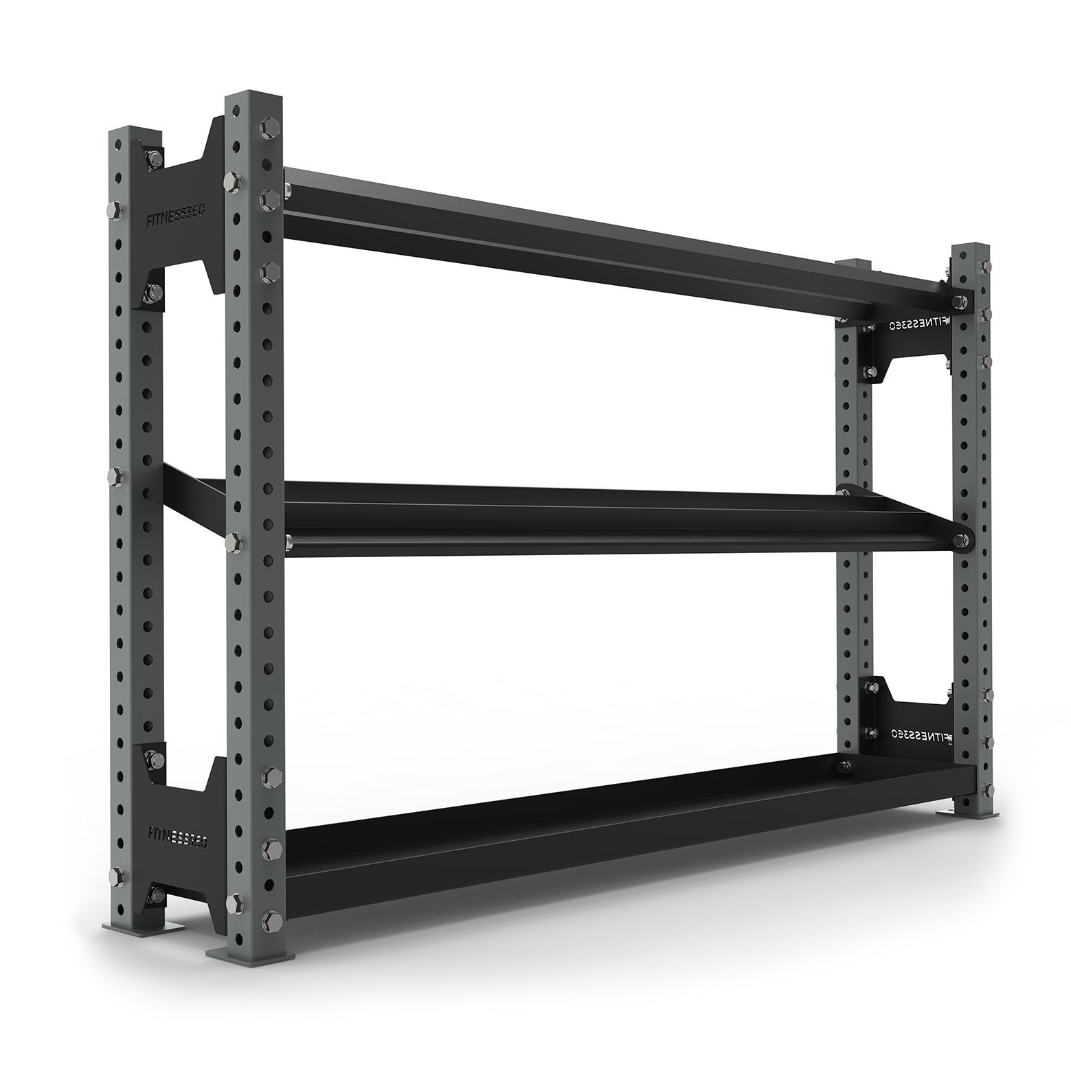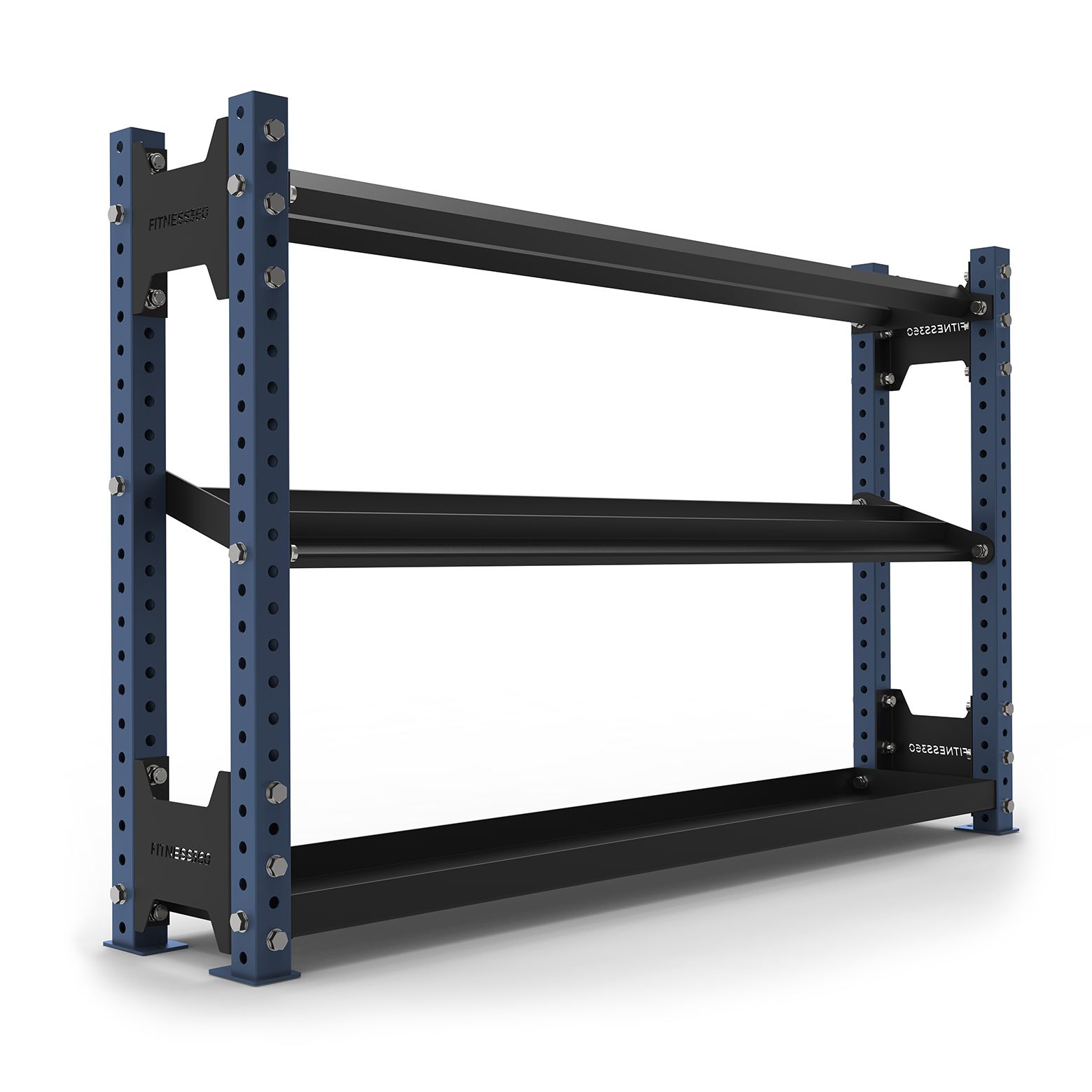 Multi reolsystem med 3 slags hylder i forskellig længde. Ideel til opbevaring af håndvægte, kettlebells, vægtskiver og bolde, grundet størrelsen på hylderne. Denne opbevaringsløsning er ideel til placering under spejle eller vinduer, grundet den lave højde på reolen. Dette reolsystem fås også i en kortere version på 120 cm i bredden. Du kan altid kombinere/tilføje flere korte sektioner, hvis behovet for mere opbevaring opstår.