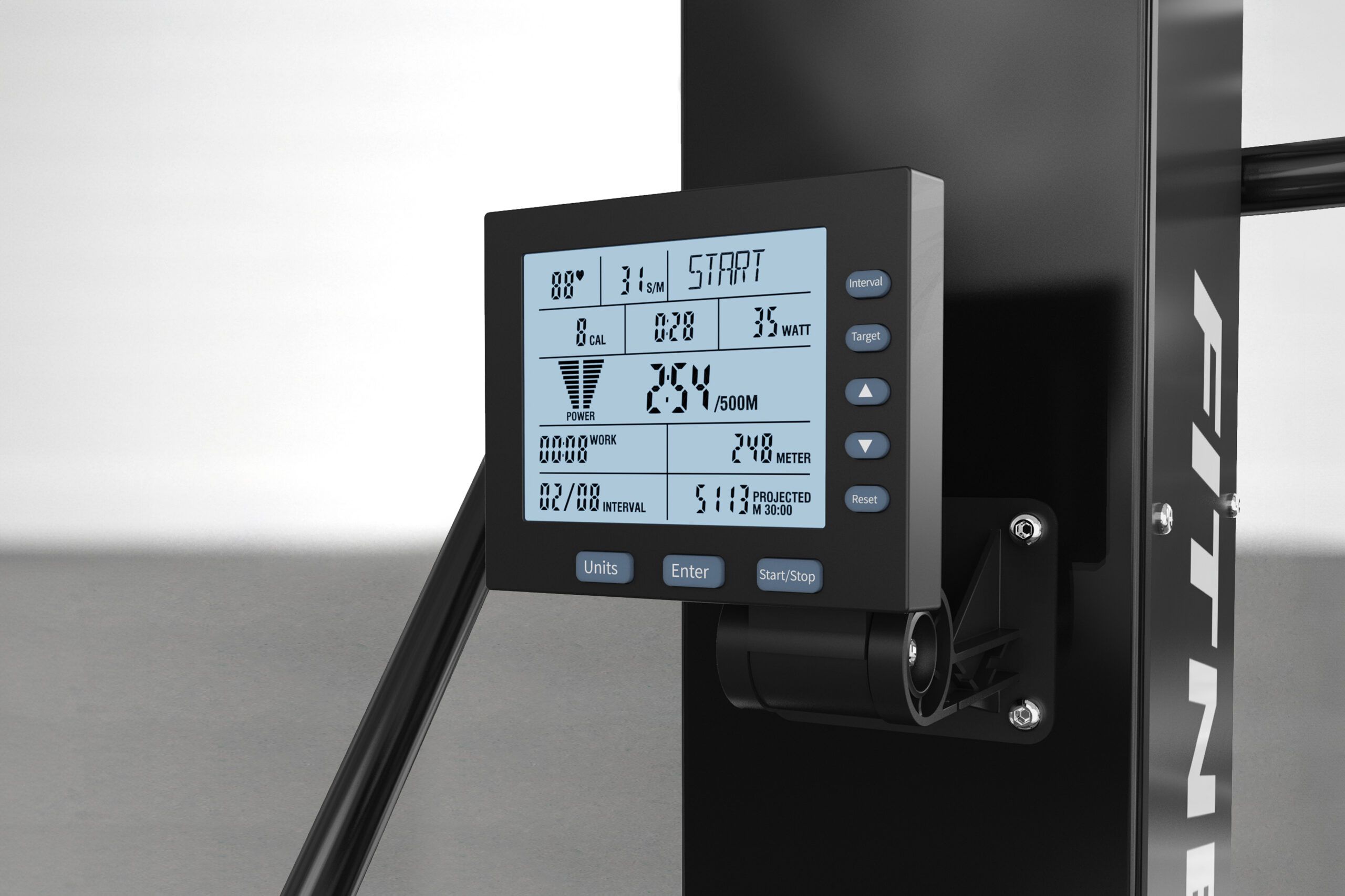 Skærmen kan vise alle tænkelig data, herunder: total distance, tid, kalorier, WATT & AVE WATT, hastighed (både nu og gennemsnitligt/500 m), projekteret mål hvis hastighed holdes, power bar og puls, hvis du selv har et pulsbælte med bluetooth. Via bluetooth kan du også koble dig på Kinomap appen via din telefon.