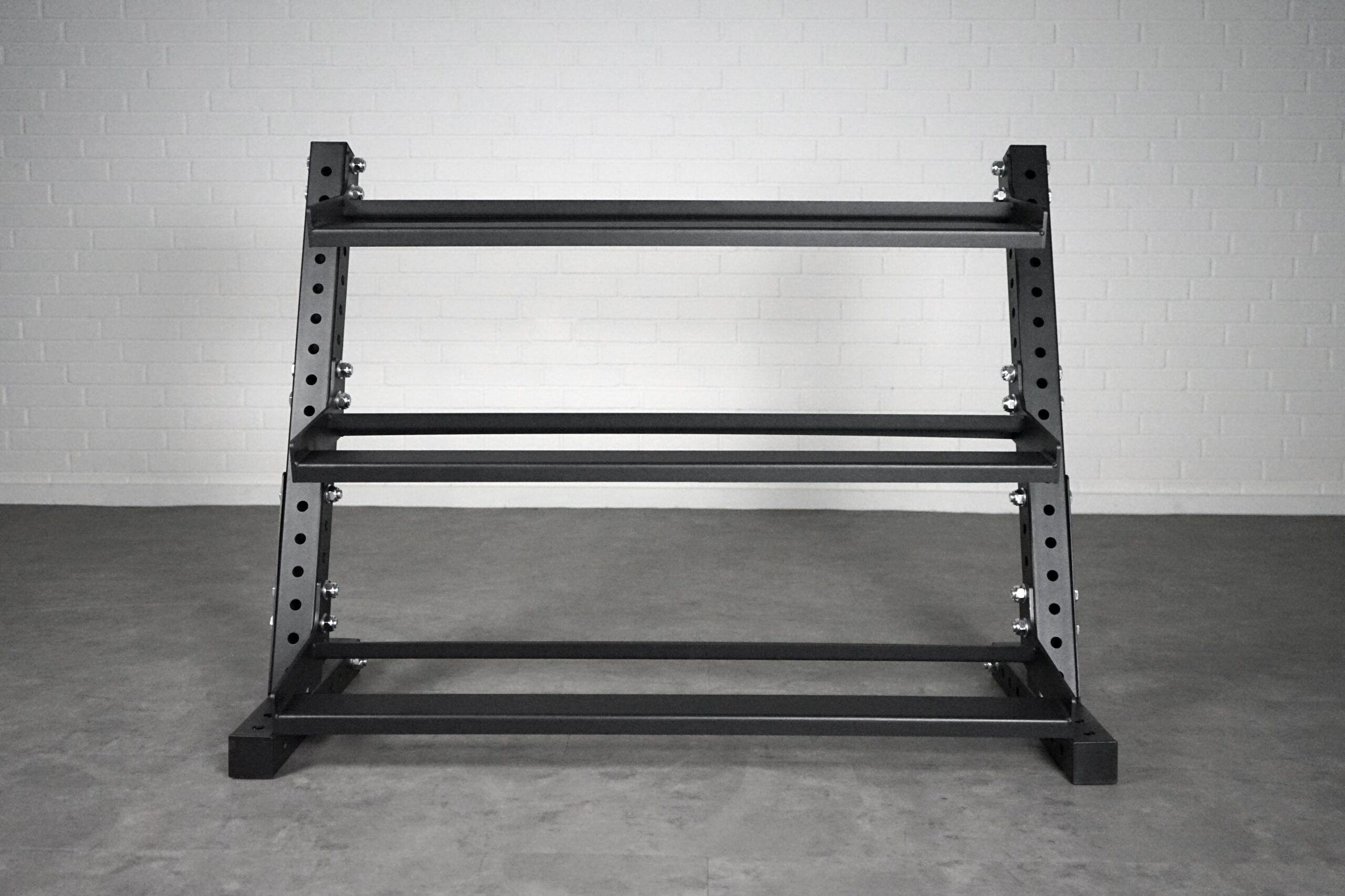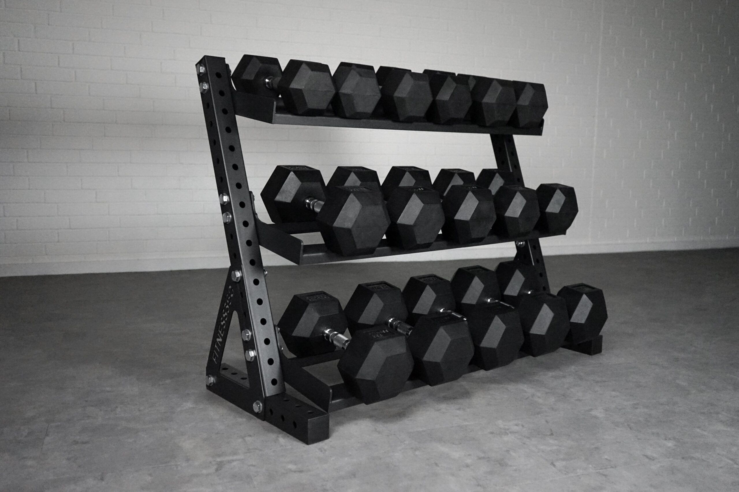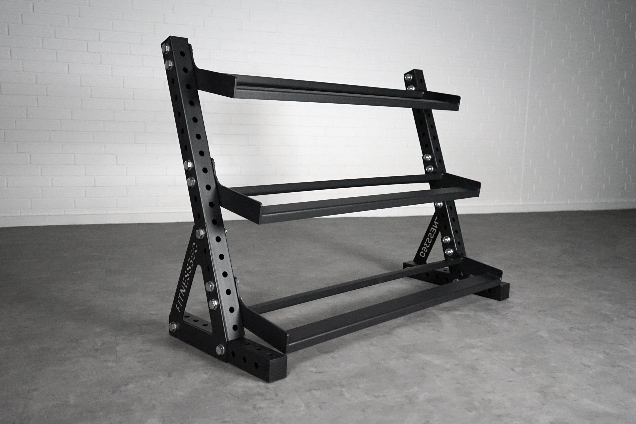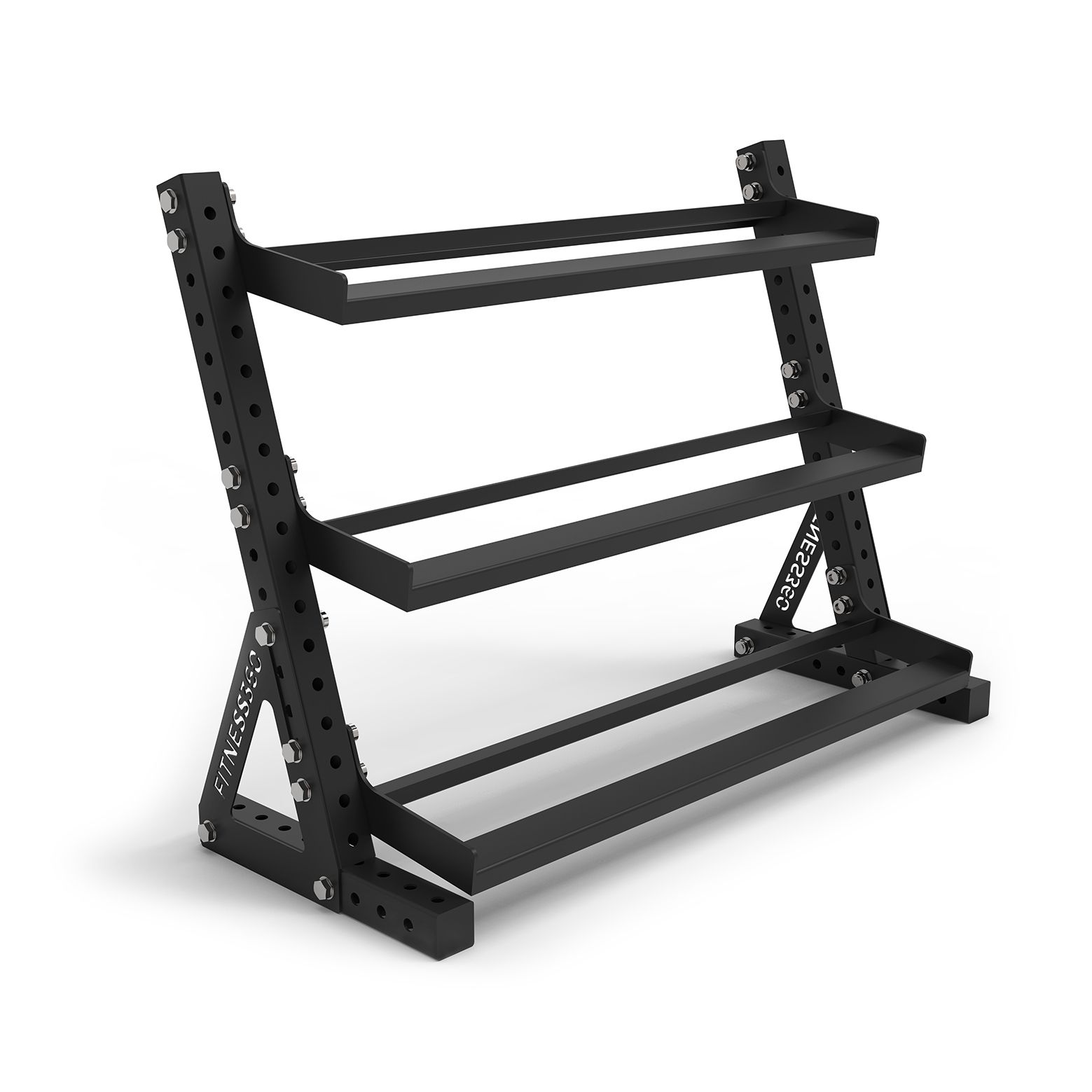 Stativ til håndvægte med plads til opbevaring af større håndvægte/dumbbells. En pladsbesparende løsning der er ideel til både home gyms og kommercielle lokationer. Hjælp dig selv (eller dine medlemmer) med at holde orden på håndvægtene, ved at fremvise udvalget af dumbbells på en pæn og overskuelig måde. Det er træls for alle, når håndvægte ligger og flyder på gulvet, og det er uoverskueligt at finde den rigtige. Du vil med garanti få stor glæde af dette stativ til håndvægte! Hver hylde har en stålkant, så håndvægtene forbliver på stativet.