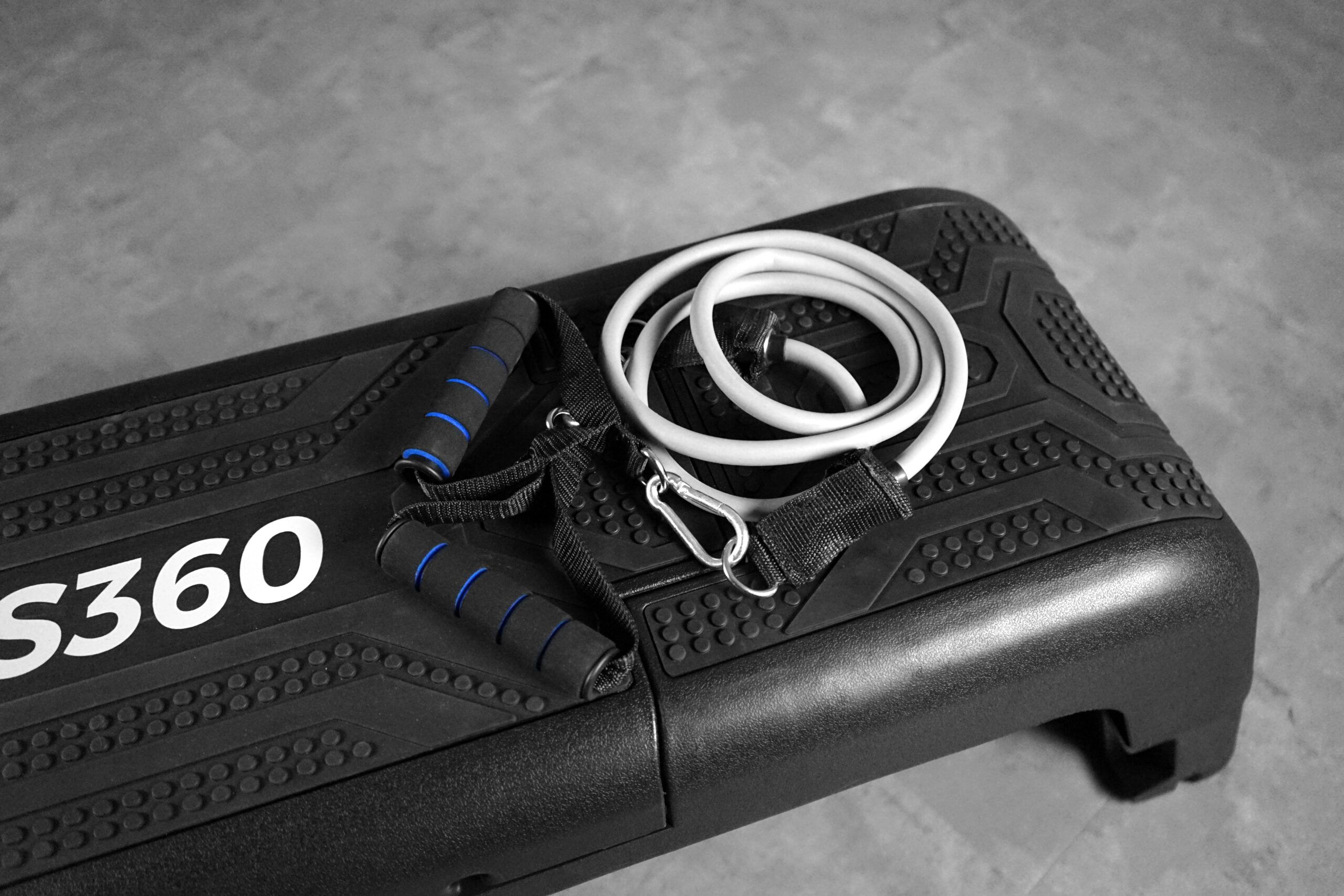 Med vores justerbare step- og træningsbænk får du også en træningselastik på 150 cm med to aftagelige håndtag. Elastik kan bruges til at sætte ind i rillerne, som findes flere steder på bænken. Der findes 4 riller på bagsiden af bænkens ryglæn, samt en rille på både forfoden og en på bagfoden. Brug rillerne i fødderne, når du ligger på bænken, og træn eksempelvis chest press eller flyes. Brug rillerne i bænkens sæde til eksempelvis row-øvelser siddende på gulvet. Øvelsesmulighederne er næsten uendelige!