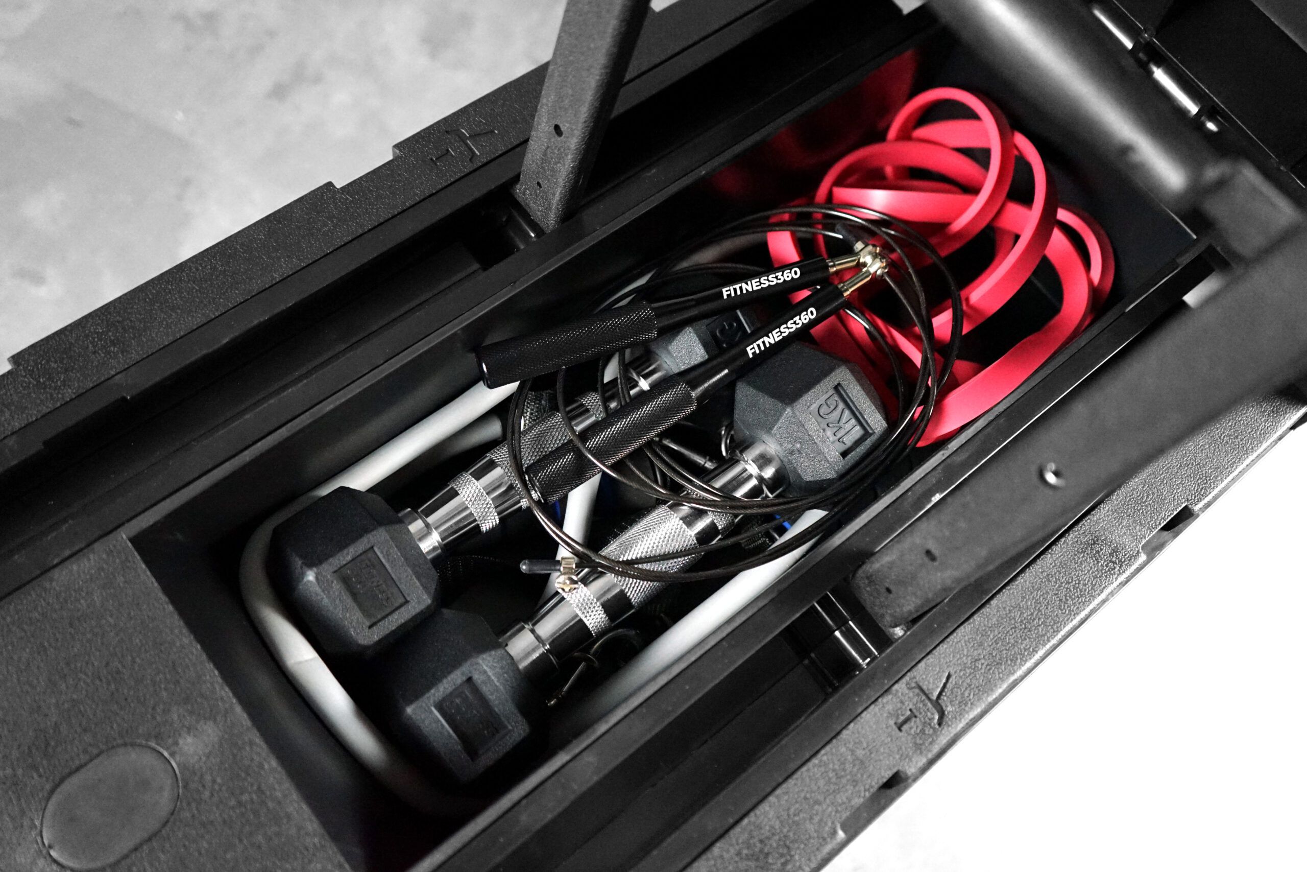 Under bænkens sæde finder du et opbevaringsrum på 5,6 liter – svarende til et rum på cirka 40x14x10 cm. Her er der fin plads til den medfølgende træningselastik samt lidt af dit øvrige træningsudstyr. Der er eksempelvis fin plads til et par mindre håndvægte, elastikker, speed ropes eller andet mindre udstyr, som kan pakkes pænt væk, når du er færdig med at træne.