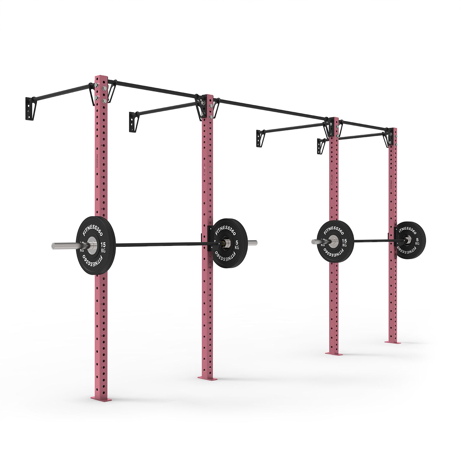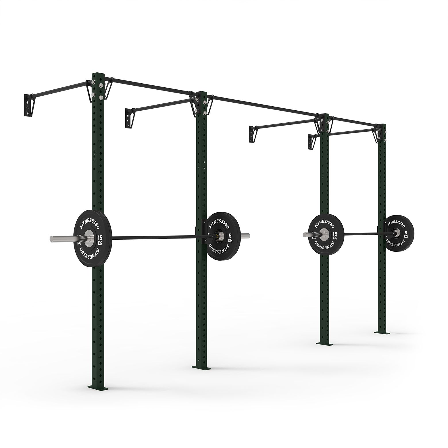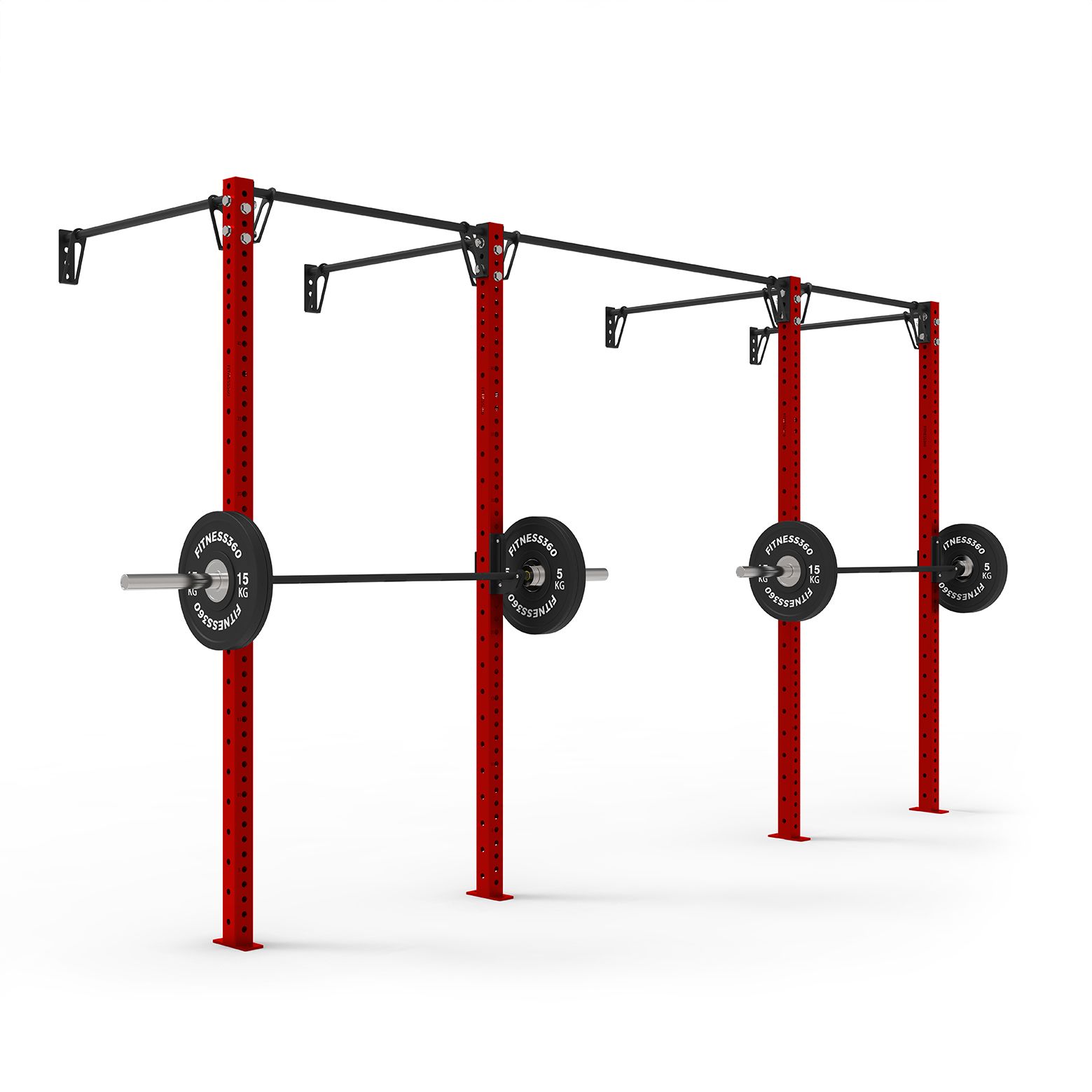 Dette vægmonteret rig består af 4 stk. stolper på 256 cm, 6 stk. pull up bars på 108 cm og 1 stk. pull up bar på 180 cm. De inderste bars skal monteres i væggen og fungerer som stabilisatorer.
